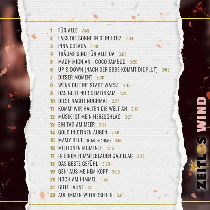 „Lass die Sonne in dein Herz“ – So lautet nicht nur einer der Titel, mit denen die Gruppe Wind unser Land 3 X beim ESC (damals hieß der Wettbewerb noch Grand Prix Eurovision de la Chanson) vertreten hat, „Lass die Sonne in dein Herz“ ist seit je her auch das Motto der Musik und ihrer Darbietung der Formation um Leadsänger Andreas Lebbing. Es ist nun genau 40 Jahre her, dass die Gruppe Wind im Jahr 1985 bei der internationalen Veranstaltung Grand Prix Eurovision de la Chanson in Göteborg mit ihrem Hit „Für alle“ (damals noch mit Rainer Höglmeier als Sänger) einen sensationellen 2. Platz für Deutschland holte. Zwei Jahre später – im Jahr 1987 – bei der internationalen Veranstaltung Grand Prix Eurovision de la Chanson in Brüssel gelang es der Gruppe Wind mit ihrem heute wohl bekanntesten Hit „Lass die Sonne in dein Herz“ erneut den 2. Platz für Deutschland zu holen, diesmal mit Andreas Lebbing als Frontmann. Wind wurden damit zur festen Größe am deutschen Schlagermarkt. Es folgten vier Jahrzehnte jeder Menge weiterer Hits und kreativer Albumveröffentlichungen. Die beliebte Reihe „Zeitlos“ trifft eine Auswahl von 22 Titeln, die von besagten internationalen Erfolgen mit „Für alle“ und „Lass die Sonne in dein Herz“ über weitere Hits wie „Pina Colada“, „Träume sind für alle da“ (deutscher ESC-Beitrag des Jahres 1992 mit Albert Oberloher als Sänger), „Mach mich an – Coco Jamboo“, „Up & Down (nach der Ebbe kommt die Flut)“, „Geh aus meinem Kopf“, der Weihnachtshymne „Hoch am Himmel“ bis hin zu ihrer aktuellen Single „Auf immer Wiedersehen“ aus dem Jahr 2025 einen repräsentativen Blick auf das Schaffen der Gruppe Wind erlaubt. „Zeitlos“ Wind darf in keiner Schlagersammlung fehlen, das ist „gute Laune“ pur!