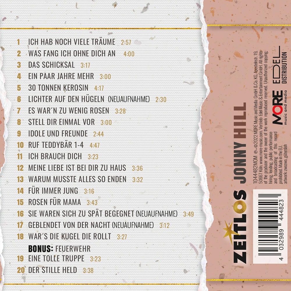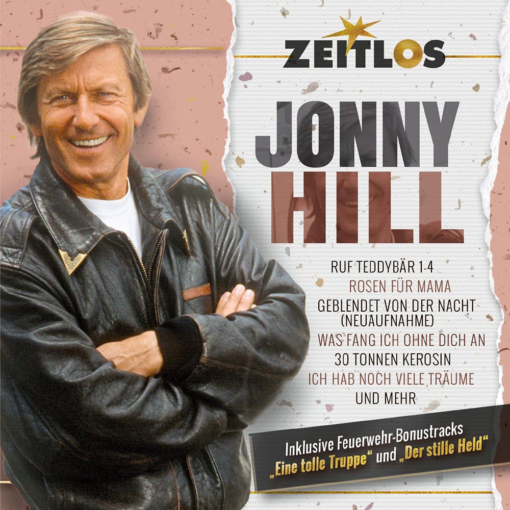 Im Rahmen der Reihe „Zeitlos“ gibt es nun eine neue Titelzusammenstellung, die Jonny Hill persönlich vorgenommen hat. 20 Songs, natürlich inklusive „Ruf Teddybär 1-4“, aber auch inklusive „Rosen für Mama“, „30 Tonnen Kerosin“, „Was fang ich ohne dich an“, „Ich hab noch viele Träume“, Neuaufnahmen von „Geblendet von der Nacht“ und „Sie waren sich zu spät begegnet“ und vielen weiteren. Songs, in denen sich Jonny Hill nicht scheut, über große Gefühle und sensible Themen zu singen. Eben typisch Jonny Hill.